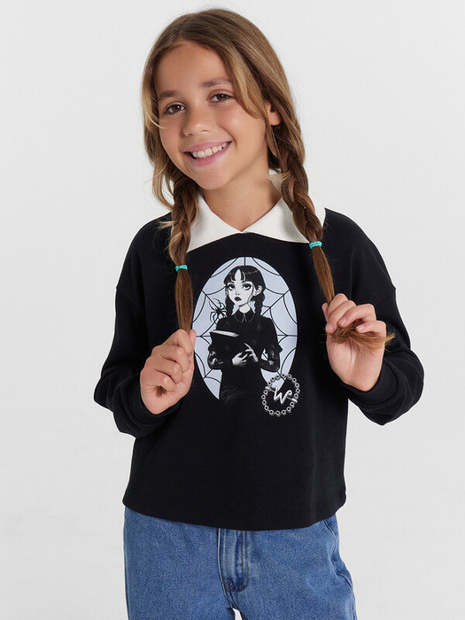 Свитшот с классическим воротником и принтом "Уэнздей" добавит яркости и стиля в гардероб каждой девочки. Модель свободного силуэта обеспечивает комфорт и свободу движений, что особенно важно для активных детей. Длинные рукава с эластичными манжетами из рибаны гарантируют удобную посадку и дополнительное тепло. Спущенная линия плеча и круглая горловина с классическим воротником придают свитшоту стильный и элегантный вид. Изготовленный из хлопковой кулирки, он обеспечивает мягкость и отличную воздухопроницаемость, идеально подходящие для повседневного ношения. Этот свитшот станет любимой вещью в гардеробе каждой девочки, сочетая в себе комфорт и стиль.