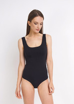 Фирменный фигурный вырез на спине визуально удлиняет талию и подчеркивает естественные изгибы тела. Эластичные вставки по краю выреза и вдоль линии бедер гарантируют идеальное прилегание, а практичная застежка-поло на трех кнопках делает использование удобным.