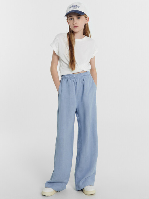 Брюки для девочек широкие. Посадка высокая. Пояс цельнокроеный из основного полотна, застрочен с эластичной тесьмой RV40 внутри, по поясу проложены отделочные строчки. В боковых швах обработаны карманы. Низ брюк обработан швом в подгибку.