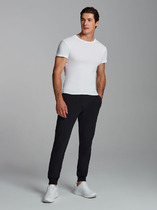 Боковой шов смещен в сторону переда. По бокам настрочены лампасы из кулирки.