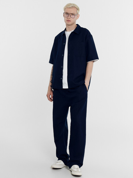 Брюки прямые, посадка средняя. Пояс отрезной с эластичной тесьмой внутри. По переду пробиты петли и втянут шнур-бейка из основного полотна с застроченными концами. В боковых швах обработаны карманы. По переду обработан гульфик с супатной застежкой на петли и пуговицы. На задней правой половинке накладной карман. Нижние срезы брюк обработаны швом вподгибку.
