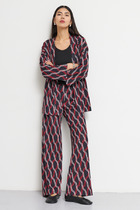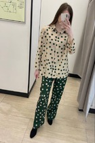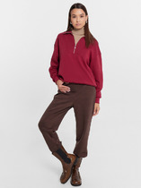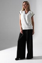 Брюки женские прямого силуэта из ткани. На деталях переда карманы с отрезным бочком. Пояс отрезной состоит из двух частей, задняя часть пояса присборена на резинку. Посадка средняя.