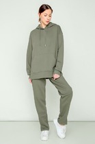 Брюки изготовлены из трикотажного полотна футер. Брюки прямые с высокой посадкой. Пояс отрезной из рибаны с эластичной тесьмой внутри. В передней части пояса с лицевой стороны пробиты петли и втянут шнур. Шов втачивания пояса распошит. Спереди обработаны карманы хулиганы. По низу брюк отрезные манжеты из рибаны.