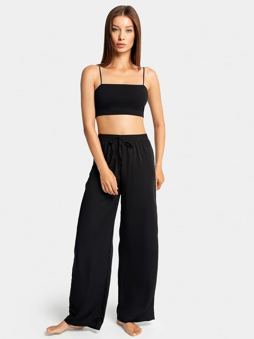 Брюки с посадкой на талии свободного силуэта. Пояс цельнокроеный с резиной внутри. По центру пояса настрочена завязка из основного полотна. Низ изделия застрочен швом в подгибку.