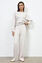 Брюки свободного силуэта. Пояс цельнокроеный, с втаченной эластичной тесьмой, отстрочен. Карманы в боковом шве. Низ брюк обработан в подгибку с эластичной тесьмой.