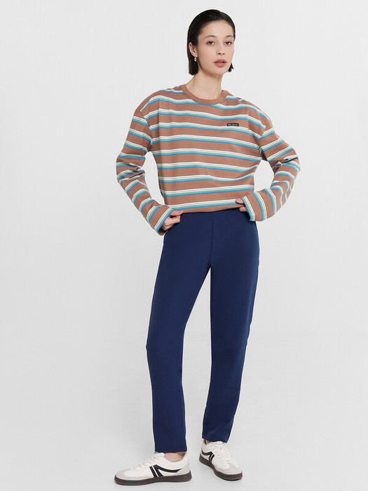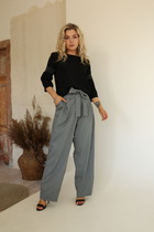 Брюки женские прямого силуэта из ткани. На деталях переда карманы с отрезным бочком. Пояс отрезной состоит из двух частей, задняя часть пояса присборена на резинку. Посадка средняя.