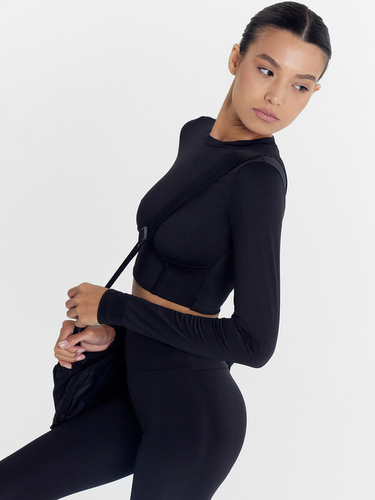 Джемпер облегающего силуэта, укороченный. Горловина округлой формы, обработана обтачкой из основного полотна.