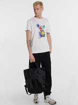 Футболка изготовлена из трикотажного полотна кулирка. Футболка свободная, прямого силуэта. Длина до линии бедер. Горловина округлой формы обработана бейкой из рибаны. Шов втачивания бейки распошит. Плечо слегка спущено. Рукава втачные короткие.