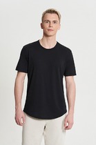 Нижние срезы футболки и рукавов обработаны швом вподгибку.