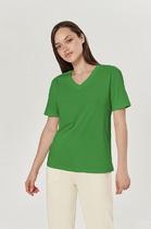 Футболка женская свободного силуэта из трикотажного кулирного пототна. Горловина круглой формы, с широкой обтачкой из рибаны. Плечо спущено, пройма углублена. Рукав втачной, длиной по локоть. Подгибка низа и рукавов широкая.