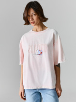 Футболка силуэта оверсайз из трикотажного полотна кулирка. Горловина круглой формы, обтачка горловины из рибаны. Шов горловины спинки закрыт бейкой из основного полотна.