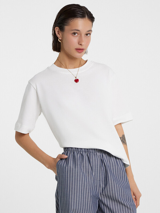Нижние срезы футболки и рукавов обработаны швом вподгибку.