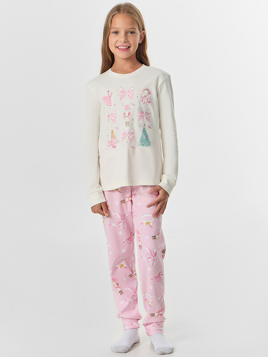 Пижама для девочек с новогодним принтом — идеальный комплект для уютных зимних вечеров. Набор из джемпера и брюк выполнен из мягкого футера, который согревает и обеспечивает комфорт во время сна.