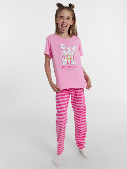 Уютная и красивая пижама для девочек. Выполнена из хлопковой трикотажной кулирки. В комплект входят футболка и брюки. Футболка с круглым вырезом, короткими рукавами. Свободный силуэт и классическая длина обеспечивают комфорт. Брюки длинные, слегка заужены к низу, с тесьмой в поясе. Комфортно и очень красиво!