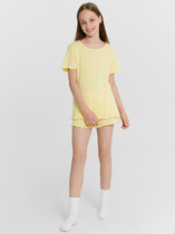 Комплект состоит из рубашки и шорт. Рубашка прямого силуэта, с отложным воротником, спинка цельнокроеная. Плечо слегка спущено. Рукав втачной, одношовный, короткий. Центральная застежка на пуговицы.