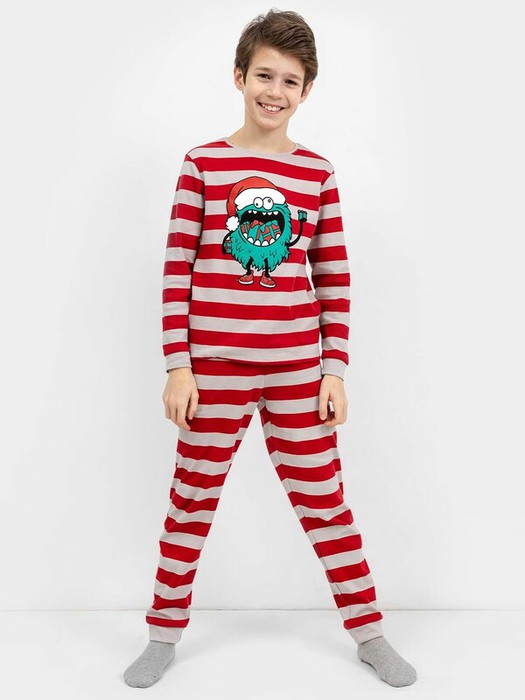 Очаровательная пижама из хлопкового интерлока для мальчиков. Включает лонгслив длиной до середины бедер и брюки прямого силуэта. Штанины и рукава завершаются манжетами. Отличный выбор для приятного сна!