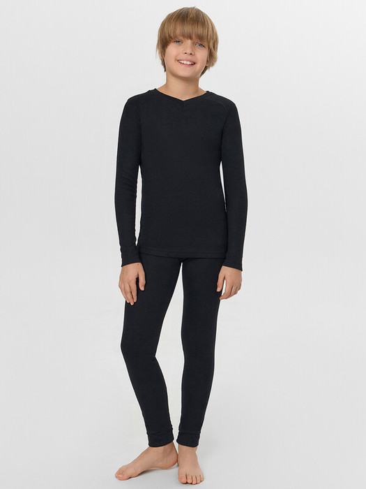 Джемпер для мальчиков прилигающего силуэта. Вырез горловины V-образный. По срезу горловины притачена обатчка из основного полотна. Рукава длинные реглан одношовные. На уровне плечевого шва стачены вытачки от горловины. Низ демпера и рукавов обработан швом вподгибку. Леггинсы для мальчиков изготовлены из трикотажного полотна-термо. Без боковых швов, плотно облегающие бедра и ноги по всей длине. На передней части обработана планка с вытачкой на подкладке. Задняя часть с швом сидения. Швы притачивания планки распошиты на плоскошовной машине