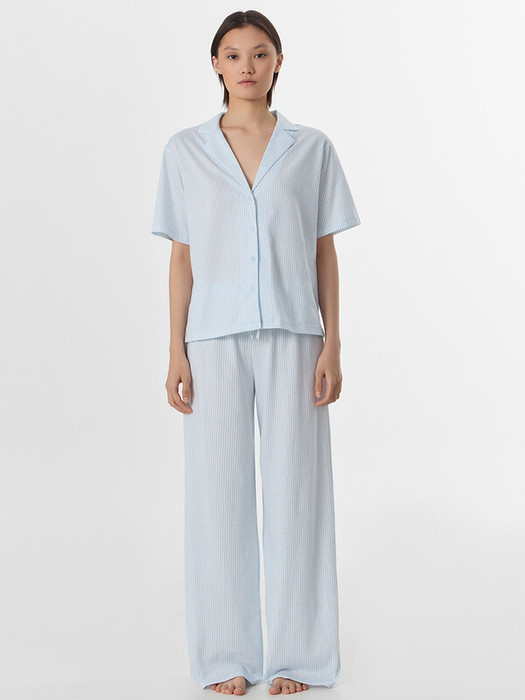 Рубашка с отложным воротником и короткими рукавами создает элегантный расслабленный образ. Центральная застежка на пуговицах и аккуратная обработка всех швов подчеркивают качество исполнения. Брюки с эластичным поясом на кулиске мягко сидят на талии, не стесняя движений.