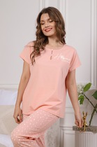 Комфортная пижама женская в "костюмном стиле" из высококачественного хлопка для приятных снов и домашних дел. Рубашка прямая, с отложным воротником и лацканами, короткими рукавами, застегивается на пуговицы. Дополняют ее свободные шорты длины мини с резиновой тесьмой в поясе, и атласной тесьмой, которая завязывается на бантик. Особенность модели пижамы – контрастные канты на рукавах, воротнике и передней части рубашки. В пижаме абсолютно не жарко, комфортный материал не сковывает движений. Красивая и интересная модель на каждый день. В линейке много интересных расцветок, широкий размерный ряд, есть актуальные варианты для девушек с пышными формами plus-size. Лучший выбор домашней одежды на каждый день от Mark Formelle. Рекомендуем!