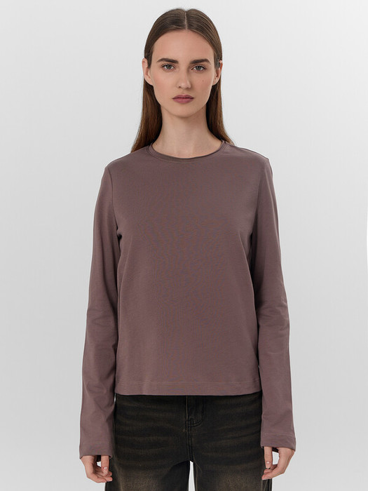 Лонгслив изготовлен из трикотажного полотна кулирка. Лонгсливпрямого силуэта.. Горловина обработана обтачкой с открытым срезом. Шов втачивания обтачки по спинке закрыт бейкой из основного полотна. Рукава втачные длинные. Нижние срезы лонгслива и рукава обработаны швом вподгибку