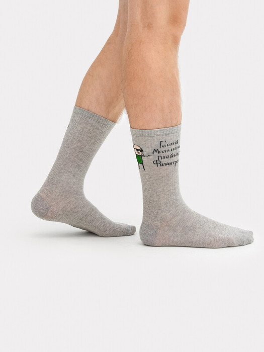 Рис.2503  Мужской носок с высоким плотным бортом и рисунком в виде надписи "Гений, Миллионер, Плейбой, Филантроп".
