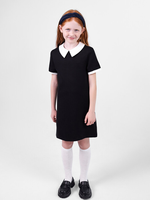 Платье полуприлегающего силуэта, длиной выше колен. Перед и спинка цельнокроенные. Горловина круглой формы. Обработана воротником из текстильного полотна. По спинке застежка на молнию. Рукава короткие. По низу рукавов манжеты из текстильного полотна. Низ изделия обработан на 2-х игольной плоскошовной машине швом в подгибку.