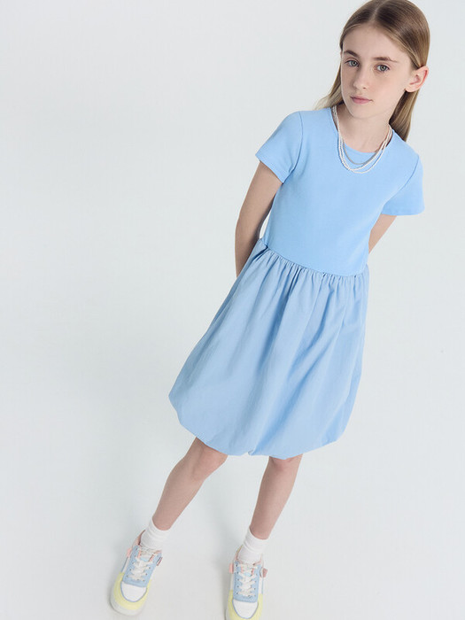 Платье полуприлегающего силуэта с отрезной линией талии. Верх платья из полотна трикотажного рибаны 2*2. Рукава втачные короткие. Круглый вырез горловины. Горловина обработана бейкой  в чистый край. Юбка балон выполнена из ткани с подкладкой из трикотажного кулирного полотна.