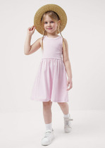 Платье для девочек свободного силуэта. Рукава втачные длинные, с отрезными манжетами из рибаны. Плечо слегка спущено. Горловина округлый формы с обтачкой из рибаны. Низ изделия обработан рибаной .