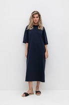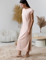 Прилегающее женское платье длиной ниже колена. Выполнено из трикотажной рибаны – в рубчик. Вырез круглый, с чуть удлиненным воротником. Рукава узкие, слегка удлиненные. От линии бедер платье расширяется и завершается асимметричным нижним краем. Красиво!