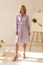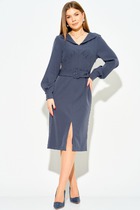 Платье полуприлегающего силуэта из ткани рошель. Горловина V-образной формы. Платье отрезное по талии, с эластичной тесьмой внутри. По эластичной тесьме проложены отделочные строчки. По детали переда средний шов. Детали спинки со средним швом. Рукав втачной, длинный. По окату слегка присборен. Длина рукава  3\4, по низу рукава настрочена эластичная тесьма которая делает сборку. Низ платья расширяется к низу. Длина платья ниже колена.