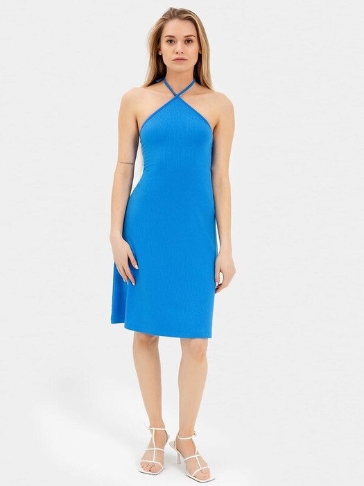Платье полуприлегающее на бретелях длиной мини из рибаны с американской проймой.