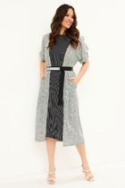 Платье женское прямого силуэта из  трикотажного полотна селаник. Горловина круглой формы, с  притачным воротником с отрезной стойкой из поплина и застежкой на пуговицу. Плечо слегка спущено, пройма углублена. Рукав втачной, длинный, по низу с отрезной манжетой из селаника. Платье длиной чуть выше колена.