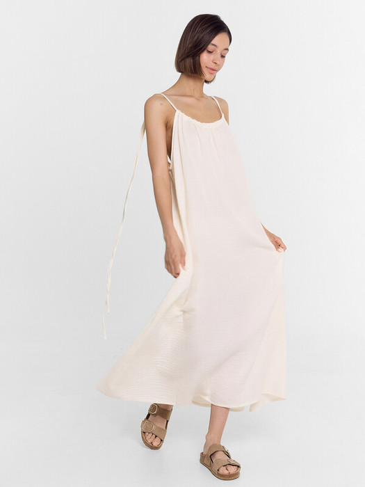 Сарафан женский свободного силуэта из ткани, муслин. Горловина с кулиской, присборена. В кулису протянута бейка, образующая бретели. Бретели завязываются на бантик. Низ сарафана застрочен швом в подгибку.