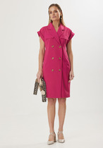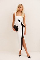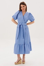 Платье изготовлено из трикотажного полотна селаник.  Платье полуприлегающего силуэта, длиной миди. Горловина с цельнокроеной стойкой. Стойка с цельнокроеной обтачкой. Рукава втачные длинные. Платье со средним швом по переду и спинке. По спинке обработана застежка на потайную молнию. В среднем шве спинки по низу разрез. Нижние срезы платья и рукавов обработаны швом вподгибку.