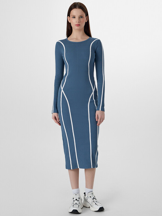 Платье женское прилегающего силуэта из рибаны. Длина миди. Рукава втачные, длинные. Горловина округлая, обработана обтачкой из основного полотна. По переду и спинке  декоративные лампасы из кулирного полотна. Низ изделия и рукава обработаны швом вподгибку.