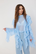 Блузка женская свободного силуэта из ткани. Блузка с цельнокроеной планкой и центральной застежкой на пуговицы. На левой детали переда накладной карман.