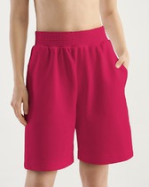 Шорты облегающего силуэта, с высокой посадкой. Длиной выше колена. Пояс отрезной фигурный. По шву сидения сзади сборка на эластичную тесьму 6мм (жилка тканая WT4-6). Шорты без боковых швов, с ластовицей. Нижний срез обработан швом вподгибку.