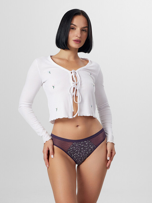 Трусы женские, средняя линия  талии, силуэт - липы. Передняя и задняя центральные детали выполнены из хлопка. Боковые детали из сетки (без боковых швов). Верхний срез трусов обработан жилкой. Нижние срезы трусов обработаны жилкой 6мм. Верхний срез подкладки ластовицы отлетной.