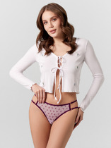Трусы женские, средняя линия  талии, слипы. Передняя и задняя детали выполнены из кружевного полотна. Рюша из кружевного полотна. Подкладка ластовицы из хлопка, отлетная по верхнему срезу. Верхний срез обработан тесьмой с зубом. Нижние срезы обработаны жилкой 6мм. Край рюши обработан закруткой.