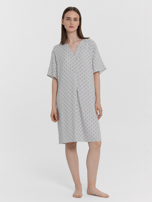 Туника женская прямого силуэта. Разрез переда обработан притачными планками с закрепкой.  Горловина круглой формы, с притачной стойкой. Рукава короткие. Нижние срезы застрочены в подгибку . Низ туники обработан швом вподгибку.