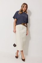 Юбка прямая, длиной миди. Верхний срез обработан обтачкой из основного полотна. Напередней и задней детали по верхнему срезу застрочены вытачки. По переду вертикальный рельеф с разрезом. В левом боковом шве застежка на потайную молнию. Нижний срез обработан вподгибку.