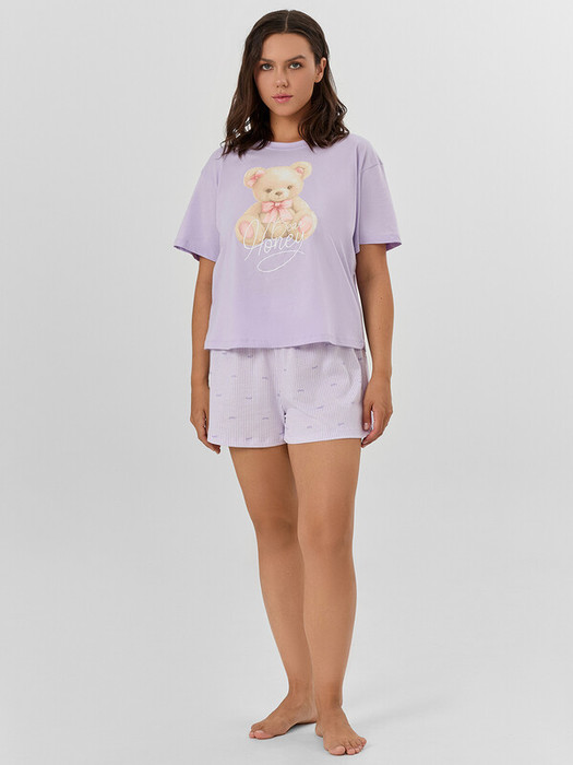Комплект женский состоит из футболки и шорт. Футболка свободного силуэта. Горловина круглой формы, обтачка из основного полотна. Рукава втачные свободные, линия плеча слегка спущена. Низ рукавов и футболки в подгибку.