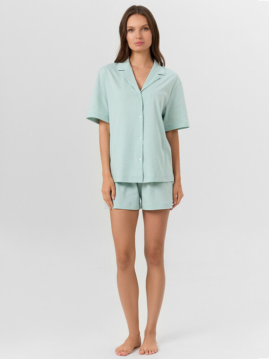 Стильный хлопковый комплект, включающий рубашку и шорты мини. Рубашка свободная, с рукавами до локтя и отложным воротничком, по центру застегивается на пуговицы. Слегка спущенная линия плеча дарит свободу движений. Шорты также свободные, с мягкой резиновой тесьмой в поясе. Удобный комплект для сна, домашних дел и отдыха!