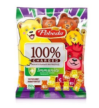 Натуральный жевательный мармелад – это, прежде всего, самое правильное лакомство для взрослых и детей. Пектин и натуральный сок, входящие в состав продукта, улучшают обменные процессы и работу ЖКТ. Мы усилили полезные свойства мармелада с помощью витаминов и микроэлементов, чтобы они поддерживали здоровье и взрослых, и детей. Мармелад Charged «Иммунитет» – мармелад со вкусом апельсина, лимона, банана и граната являются источником витаминов В1, В2, В3, В6, В12, Е, С, фолиевой кислоты и других веществ, которые усиливают защиту организма и помогают противостоять инфекциям.