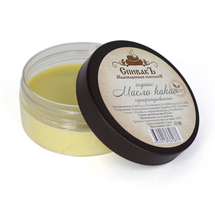 Какао-масло (Butyrum Cacao) получают путем отжима какао тертого. В составе масла Какао преобладают насыщенные (58-60%) жирные кислоты (пальмитиновая, стеариновая), из ненасыщенных (40-42%) главной является олеиновая кислота. Оказывает заживляющее , тонизирующее, смягчающее воздействие на кожу. Подходит для кожи любого типа, особенно необходимо для ухода за сухой и увядающей кожей. Идеальное средство для нежной детской кожи.