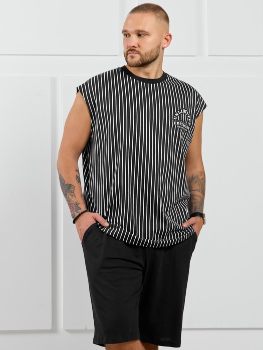 Майка мужская из трикотажного полотна с набивным рисунком в узкую черно-белую полоску. Модель свободная, со спущенной линией плеч, с принтом на груди. Овальная горловина обработана однотонно деталью.