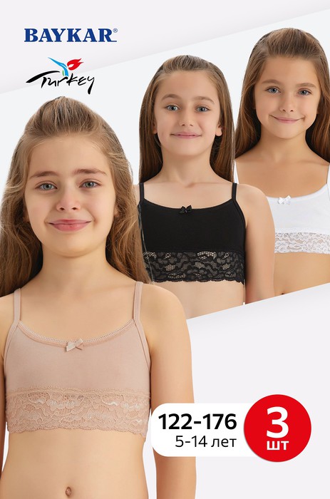 Уверенность в каждом движении! Набор детских топов из 3 штук для девочек и девочек-подростков выполнен из приятного к телу хлопка. Легкая ткань отлично пропускает воздух и делает топики для детей незаметными под школьной формой. Топы представлены в классических цветах и украшены нежным кружевом и милыми атласными бантиками.