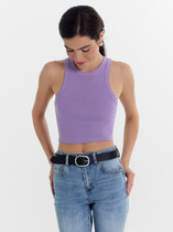 Женская майка в рубчик с вареным эффектом, круглым вырезом и широкими бретелями.