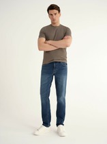 Мужские классические джинсы с пятью карманами. Посадка Comfort fit (свободные по бедру), высокая талия, широкие в колене и по низу. Застежка на молнии. Выполнены из традиционной хлопковой ткани denim. Темная стирка с камнями (stone wash).