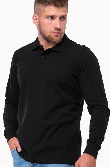 Черный лонгслив поло — лаконичный фаворит мужского гардероба, который всегда к месту. Идеальный баланс между комфортом и стильным минимализмом для повседневных образов.